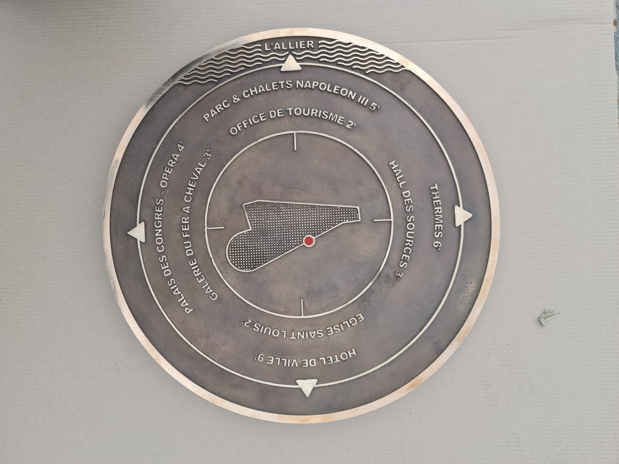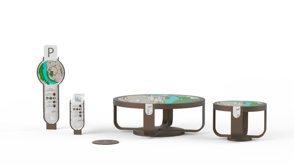 La galerie promenoir devient, elle, premier “ cercle ” pour orienter les flux à 360°. Au milieu du parc, “ point zéro ”, une table d’orientation monumentale sera disposée présentant le coeur de ville avec les bâtiments remarquables en 3D. Sur son pourtour seront disposés des médaillons photos recensant les lieux patrimoniaux situés à proximité (avec le temps piéton). Chacun représente un détail architectural du bâtiment (ou détail paysager du site) en référence à l’éclectisme architectural de la ville. 12 autres petites tables seront déployées sur des lieux stratégiques dans le périmètre du bien et dans la zone tampon.